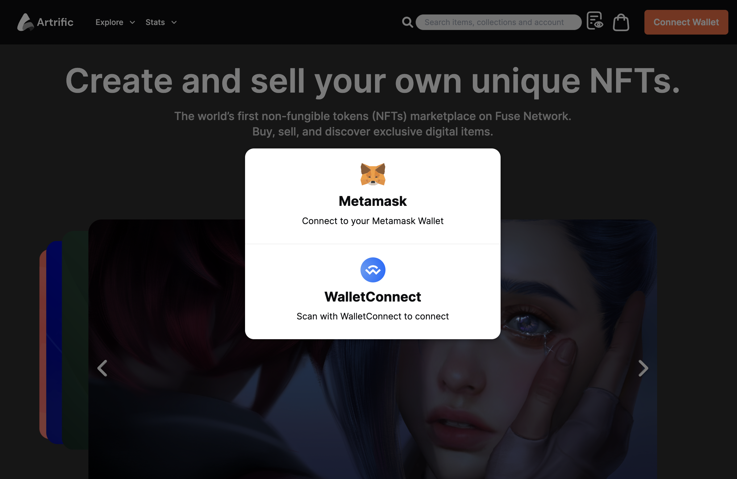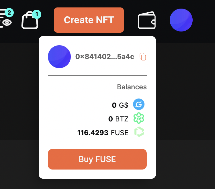 You can add FUSE by heading to the wallet icon, located on the top-right of the Artrific website. You will see a blue button titled "Buy Fuse". By clicking this button, it will direct you to the site for exchanging FUSE.