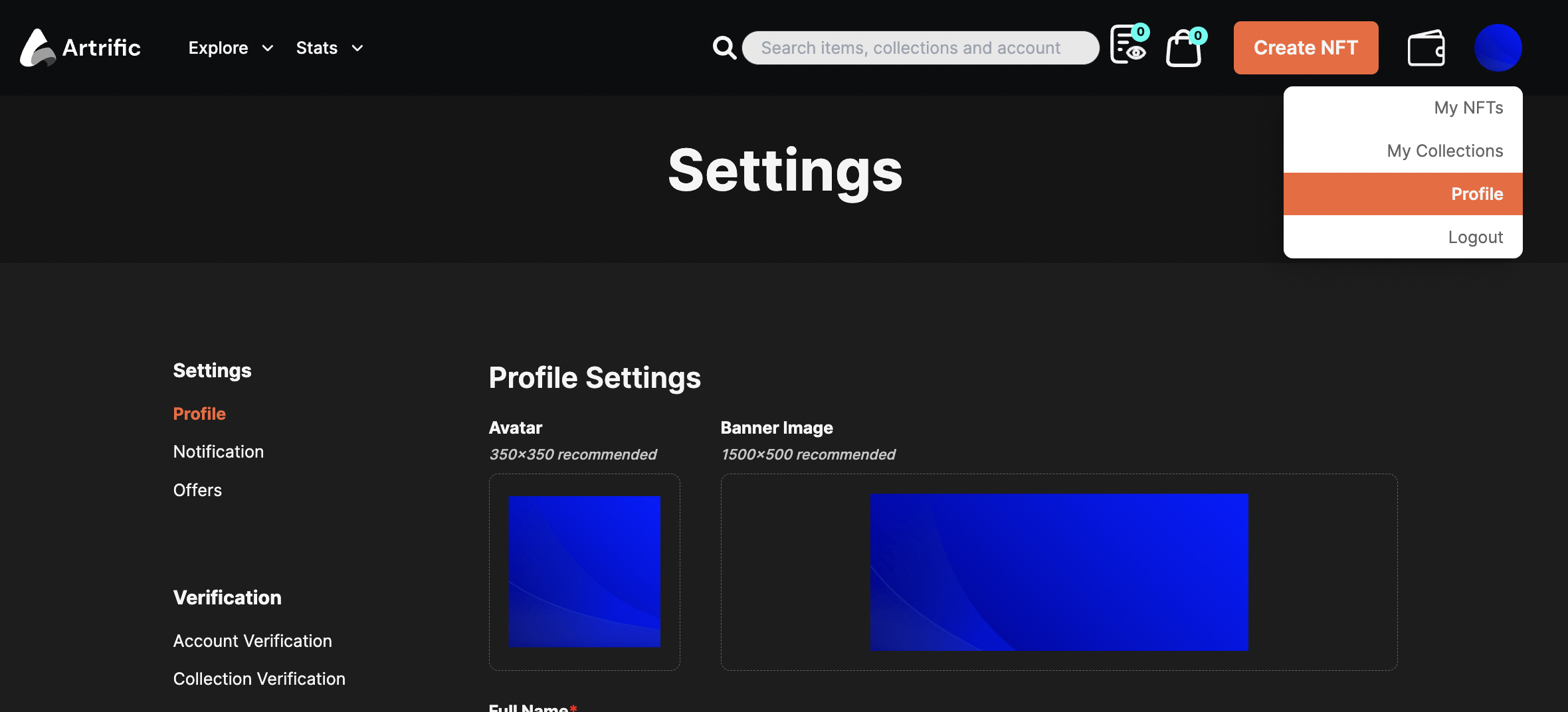 Connect your wallet to Artrific, edit your profile, and begin interacting in the space. When you arrive to Artrific.io, head to the top right profile icon, select "Connect my wallet".